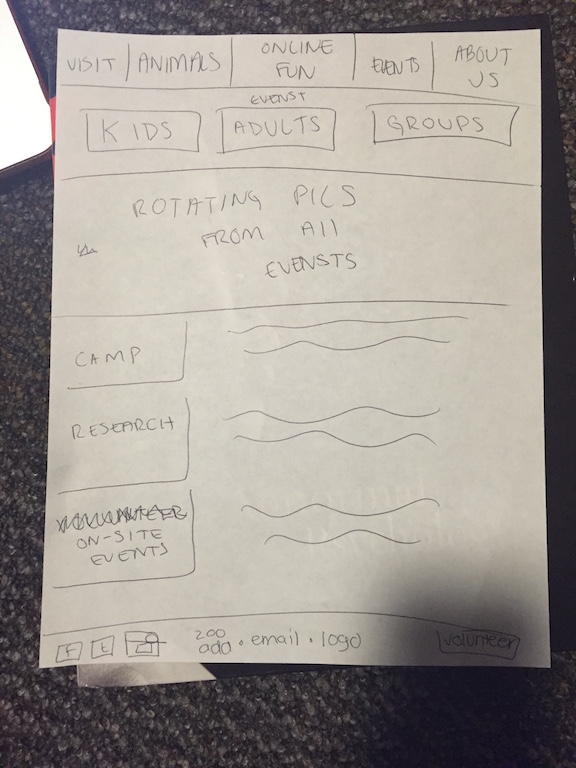 Wire frames were sketched by hand and illustrated three of the pages that would later become interactive for visitors.