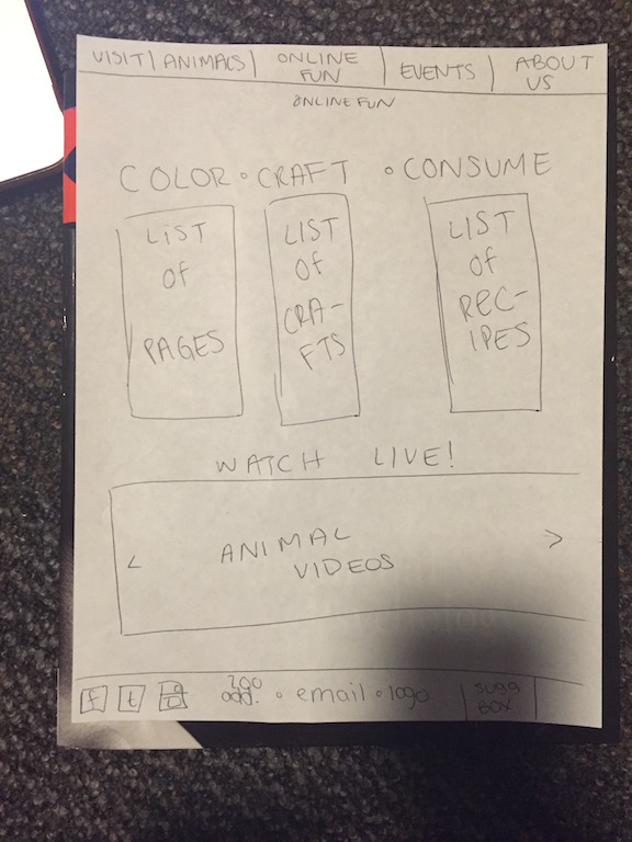 The site was then created from scratch and coded. The screenshots below illustrate the different pages that were created: the home page, animals page as well as online fun page. All three pages were linked together within the HTML and navigation bar.